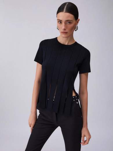 Maglia Liu jo. SKU CA6110MS55N. Liu jo Maglia nera con filati in misto viscosa Girocollo maniche corte Frange in tono colore. Composizione: Tessuto principale: 65% Viscosa, 35% Poliammide
