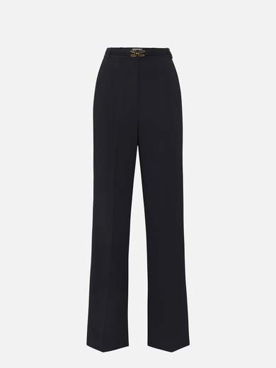 Elisabetta Franchi trousers. SKU PA08751E2. Elisabetta Franchi Stretch crepe trousers with wide leg and straight hem. They stand out for their side bands in satin ribbon. The waist is highlighted by the elastic belt with logo and gold metal plaque. Regular fit. Details: Monogram satin lining Satin inserts French pockets Belt with gold metal detail with logo Length 121 cm for size 40 IT The model is 177 cm tall and wears a size 40 IT Item composition 95% Polyester 05% Elastane Regular fit